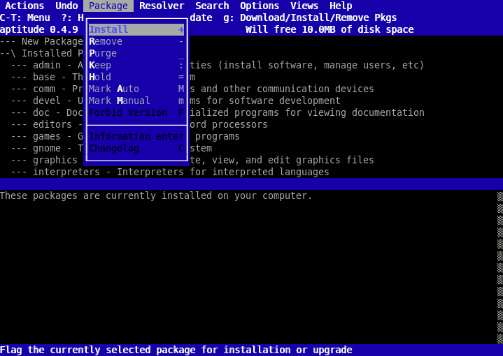 Por otra parte, si prefieres un uso interactivo, al estilo de apt o apt-get, Aptitude también lo permite, y, de hecho, emula la mayoría de comandos de apt-get, manteniendo incluso los mismos parámetros. Veamos las principales opciones…