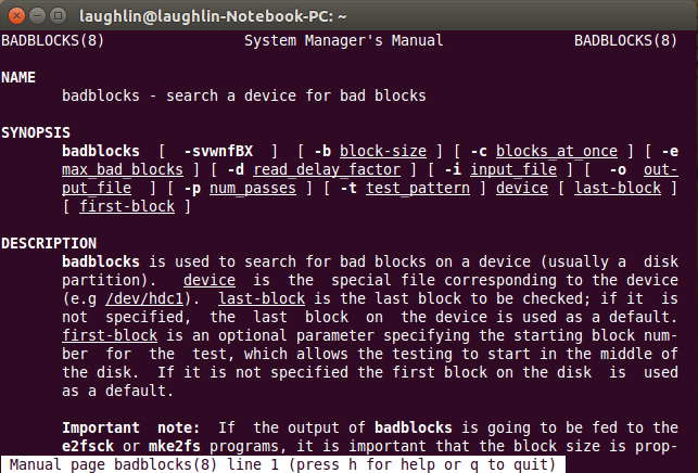 Tienes mucha más información del uso y las diferentes opciones de badblocks en esta completa wiki de Arch Linux. Además, para un vistazo de todas las opciones, puedes acceder a la guía oficial tecleando man badblocks por la terminal.