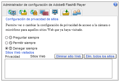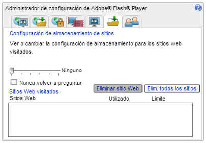 - Configuración de almacenamiento de sitios. Aquí podrás controlar los archivos que se almacenan localmente en tu equipo por parte de elementos Flash de los propios sitios web visitados. Si no quieres que se almacene ningún tipo de archivo, puedes fijar el selector en Ninguno. También tienes un listado con el historial de sitios web visitados que han almacenado bits en tu sistema.