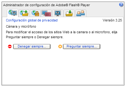 - Configuración global de privacidad. Eso no tiene que ver con los cookies, pero es una opción a tener muy en cuenta. En general, si algún elemento o aplicación con Flash requiere acceder a tu cámara o micrófono, por defecto el plugin te avisará. Si no es algo que vayas a necesitar, puedes marcar la opción Denegar siempre….