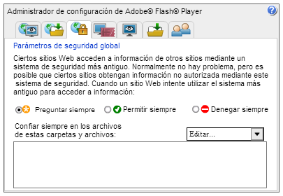 - Parámetros de seguridad global. Entiendo que se refiere al acceso al historial o información que almacena el navegador sobre otros sitios web mediante un protocolo poco seguro. Para una mayor seguridad, la configuración más restrictiva es la de Denegar siempre, pero tampoco es problema si lo dejas en Preguntar siempre.