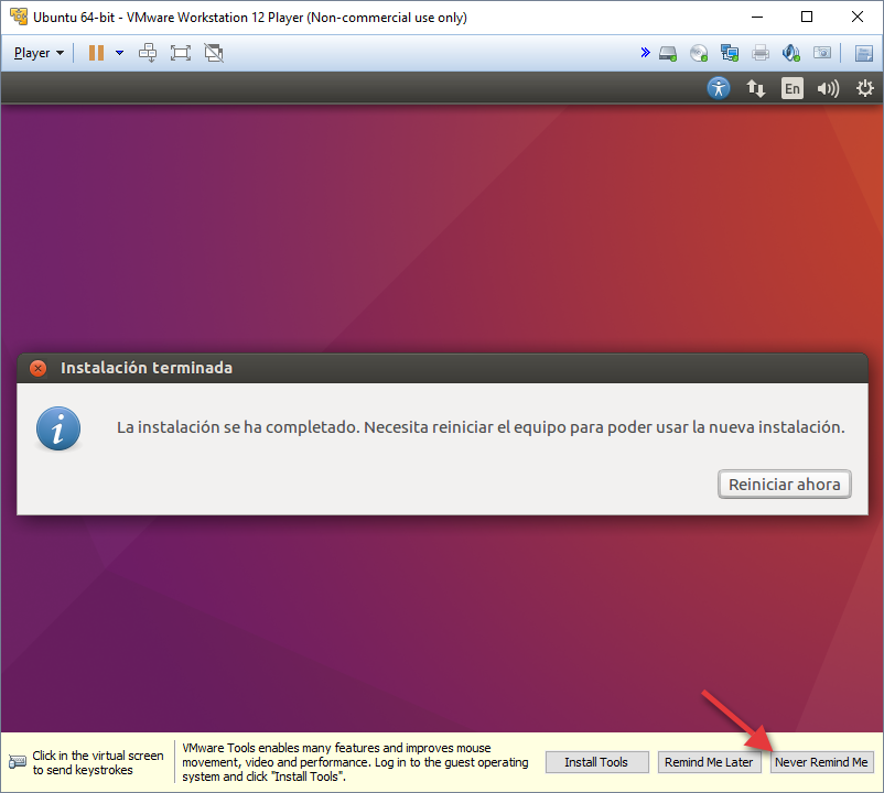 En un momento dado, verás que te aparece un cartel debajo en el que te indica la posibilidad de instalar las VMWare Tools para mejorar el soporte de hardware. Sobre esto te recomiendo que pongas Never Remind me, ya que te explicaré luego como instalar las Open-VM-Tools, que nos servirán para el mismo propósito.
