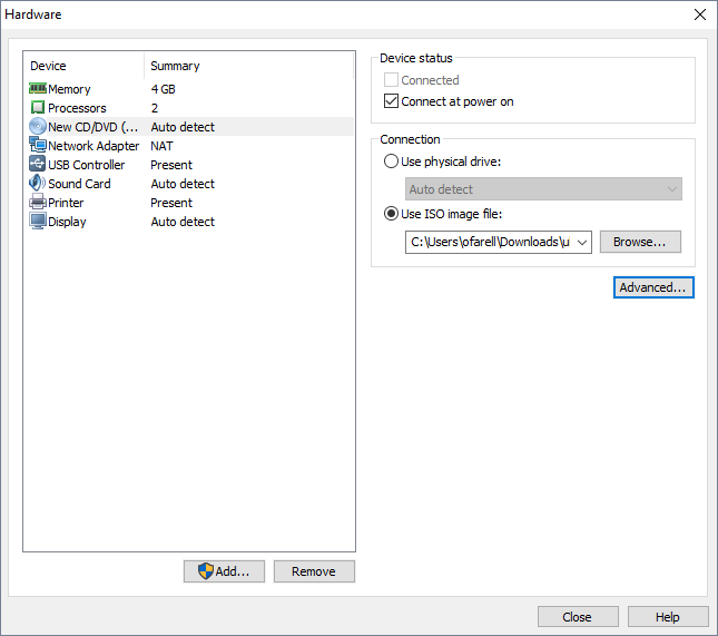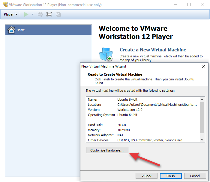 Para ello haz clic sobre el boton Customize Hardware que te indico en la captura de abajo, donde aparte de acabar de ajustar más propiedades, también podrás vincular la imagen ISO del sistema operativo que quieras instalar.