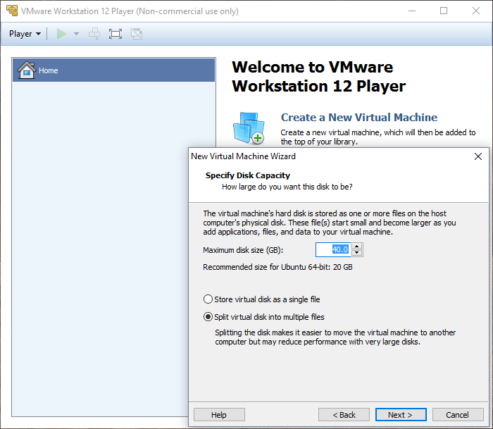 Seguidamente te pedirá indicar el tamaño que le quieres dar a la maquina virtual. Por defecto ya te mostrará de entrada el tamaño adecuado dependiendo de la elección que hayas hecho en Guest Operating system (en nuestro caso, para Ubuntu 64 bits es de 20 GB), aunque siempre es mejor aumentar un poco estos valores para ir más sobrados (yo he puesto 40).