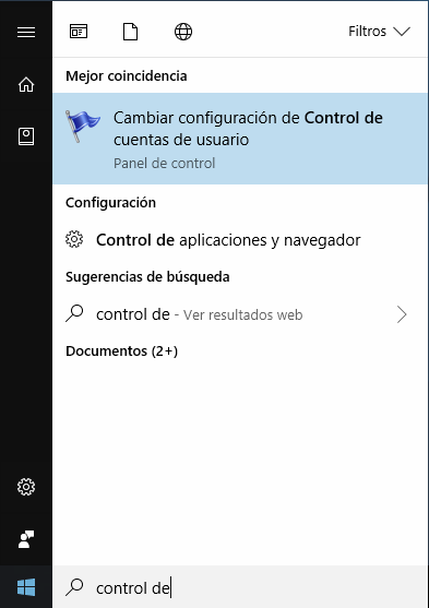 Desde Windows 7 en adelante, puedes configurar el nivel de protección de UAC (incluso deshabilitarlo) desde una ventana del Panel de Control tradicional de Windows. Si están en Windows 10, sin embargo, lo mas fácil es localizar UAC tecleando «control de cuentas» desde la caja de búsquedas al lado del menú de Inicio.