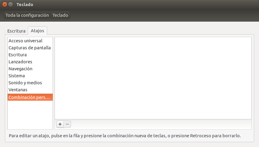 Una vez allí, si te diriges a la pestaña Atajos, en el menú lateral izquierdo verás que hay un listado de opciones, entre las que se encuentra una que pone Combinación personalizada. Al hacer clic sobre ella, verás que tienes la opción de añadir una combinación de teclado haciendo clic en el botón inferior con el signo +.