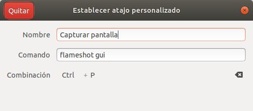 Una vez allí, tan solo debes añadir un nuevo atajo de teclado, y asociarlo al comando flameshot gui (es la sentencia que ejecuta el capturador de pantalla gráfico de Flameshot).