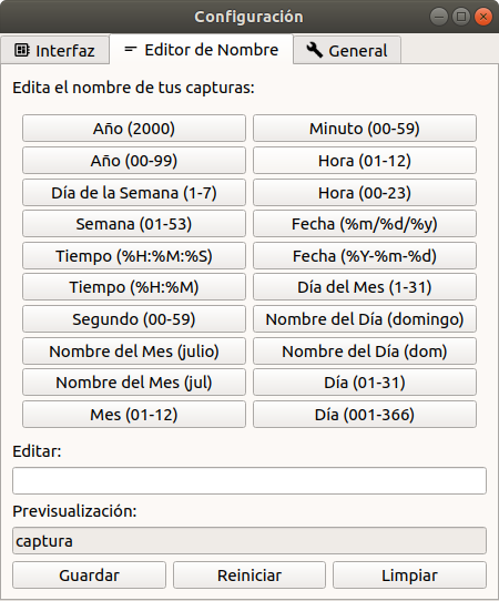 La primera, Interfaz, no es que permita hacer gran cosa, pero puedes echarle un ojo si quieres. La segunda, Editor de Nombre, te permite parametrizar el nombre con el que se guarden las capturas que vayas haciendo (básicamente en función de la fecha), y en General podrás indicar que arranque Flameshot en el inicio del sistema.