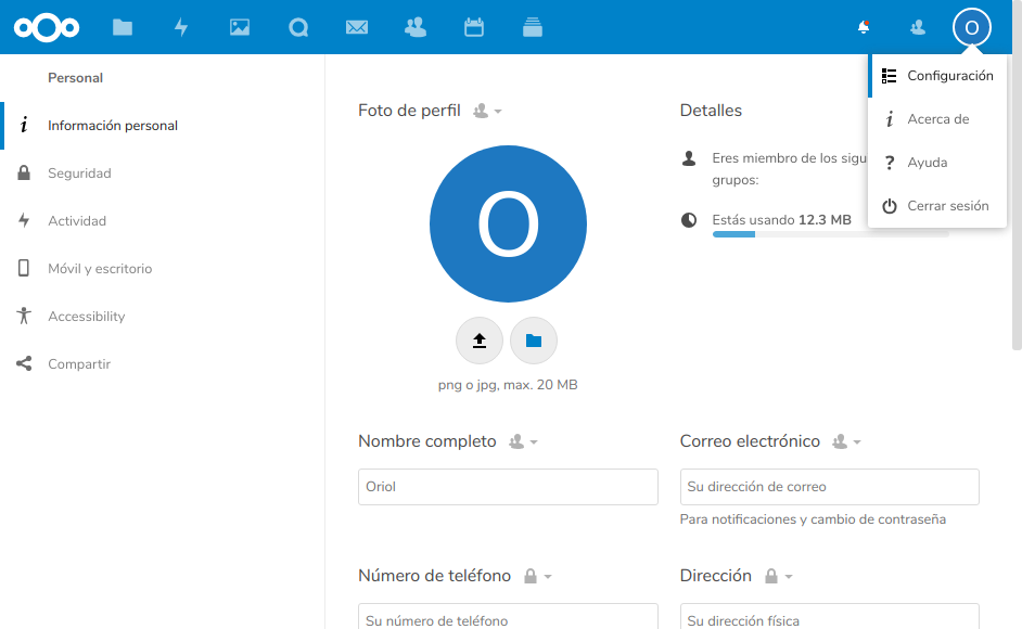 De entrada, como en cualquier sistema o plataforma, existe un usuario administrador. Este es el primero que se crea tras la instalación de Nextcloud, y es el que dispone del nivel de privilegios más elevado sobre el conjunto de la plataforma.