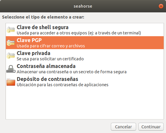 PGP, así como su implementación libre GnuPG o GPG (que es la que trato aquí), es una herramienta de cifrado que hace uso de pares de claves asimétricas, y se utiliza para el cifrado y la firma de ficheros. Seahorse es una utilidad gráfica en GNU/Linux que permite crear y administrar tus pares de claves PGP de forma rápida y sencilla.