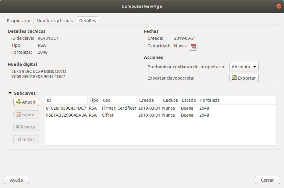 Al hacer esto, te aparecerán algunos detalles de la misma, como el tipo de cifrado, la fecha de creación de la clave y, por ultimo, la huella o el hash de la misma. Este hash debe coincidir con el que hemos visto antes en Seahorse, en en la pestaña de Detalles, en la parte de Huella Digital.