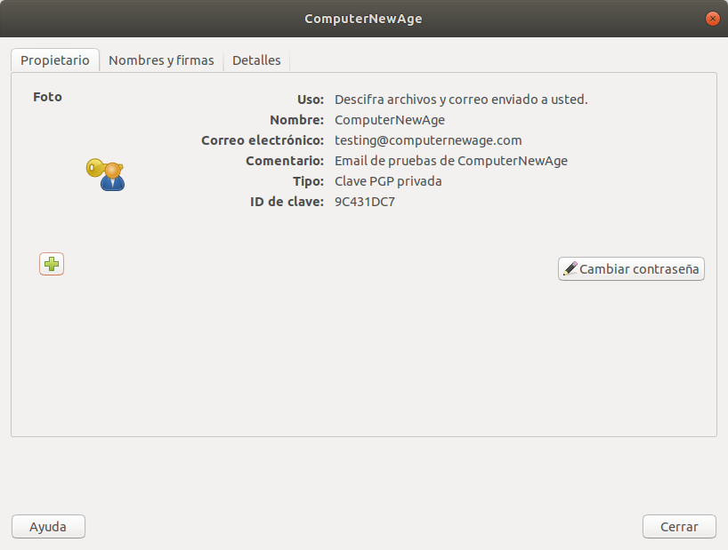 - Detalles técnicos. Aquí se muestra el ID de tu clave pública, el tipo de cifrado utilizado y la fortaleza del algoritmo de cifrado.