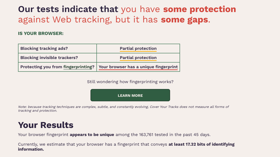 Con respecto al ultimo punto, que es de hecho de lo que trata principalmente el test, podrás hacerte una idea de en que grado tu navegador presenta una huella única, y los diferentes datos sobre él que pueden se capturados por parte de cualquier dominio con el que establezca conexión.